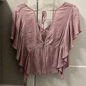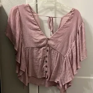 Shirt is in good condition! Buttons on the front, ruffles on the side, and a cute open-back.