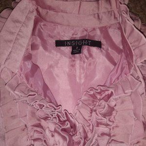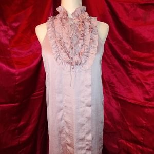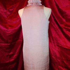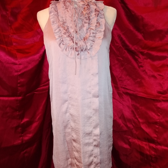 Never Worn! This is a gorgeous dress with ruffles at the top and a couple of small pleats going down the front sides. There is a tie around the neck and buttons in the ruffles. The dress falls above the knee and is very light-weight. Great for the upcoming spring and summer months!