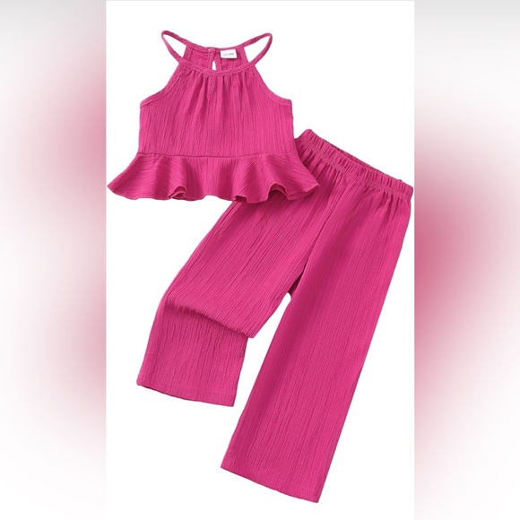 Stylish pink ruffle top with matching pants. Perfect for a chic look.