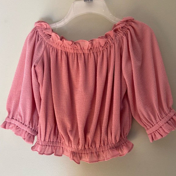 Pink top with ruffle sleeves from Express. Banded areas are stretchy. Can be worn off the shoulder. Has been worn but still in great condition