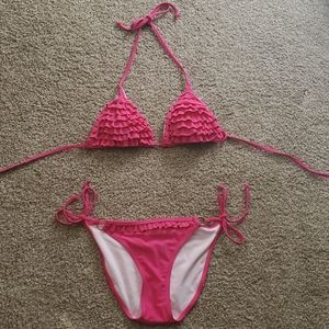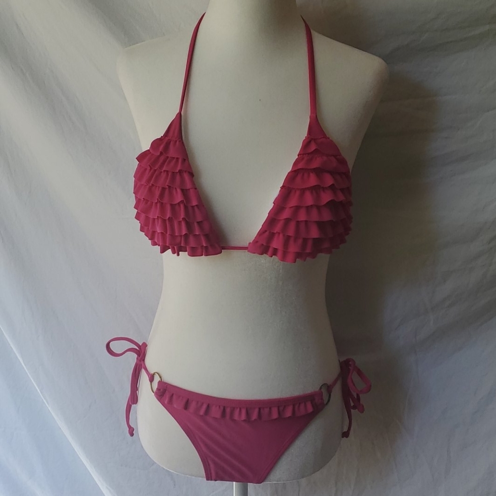 Very cute and sexy ruffled Triangle Bikini set with ties. The top has removable padding and suit is true to size. The bottoms have a little bit of pilling on the back but otherwise in great shape. Happy to sell together or separately!