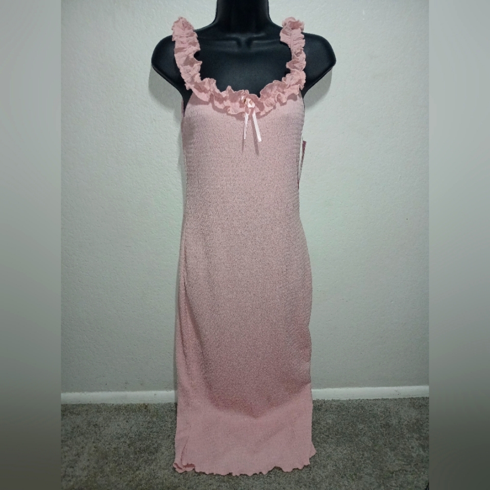 Charming pink dress with ruffle trim. Perfect for casual outings and cute rose and ribbon detail.