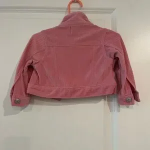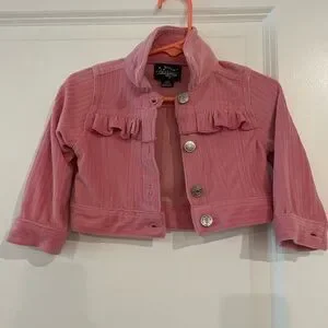 Chic pink jacket with playful ruffles. Features shiny silver buttons. 12M. 95% polyester 5% spandex.
