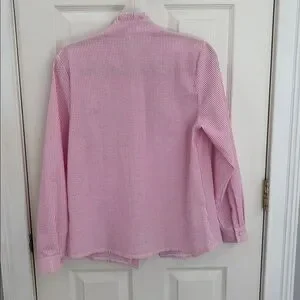 Soft pink women’s shirt with a ruffle-front placket for a charming look. Lightweight fabric and long sleeves for comfortable wear. Stylish, easy-to-layer piece for everyday or dress-up occasions.