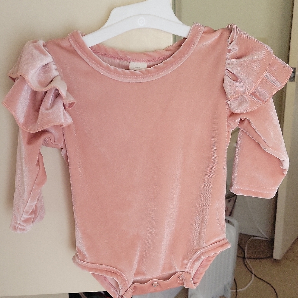 Adorable pink one piece with ruffled sleeves, perfect for your little one. Soft and comfortable for all-day wear.