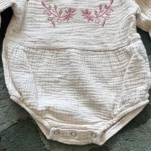 Adorable pink ruffled one piece for babies, featuring charming floral embroidery. Perfect for any occasion.