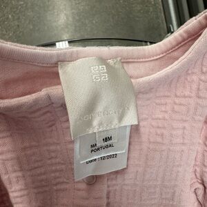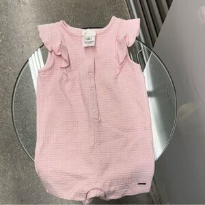 Adorable pink romper with ruffled sleeves. Perfect for a cute and comfy look.