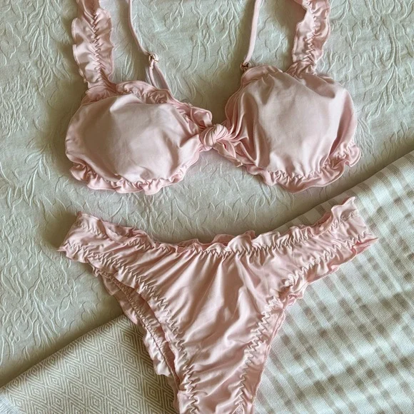 Chic pink bikini set with ruffled details. Perfect for a stylish beach day.