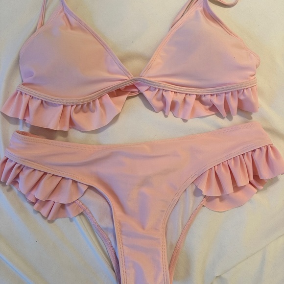 This elegant pink bikini set features charming ruffles for a playful look. Perfect for beach days and poolside lounging. Never worn just took the tags off