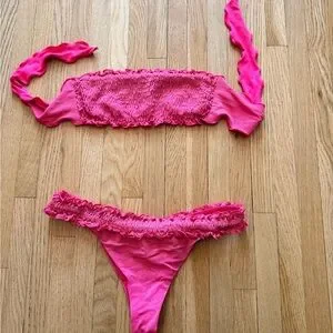 Stylish pink bikini set with ruffled details. Perfect for a chic beach look.