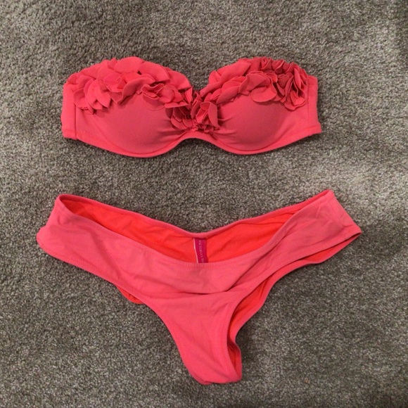 Stylish pink bikini set with ruffled top. Perfect for beach days. Cheeky bottoms