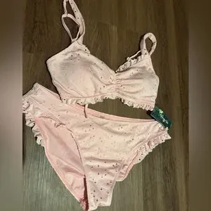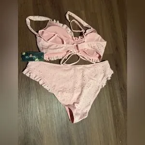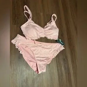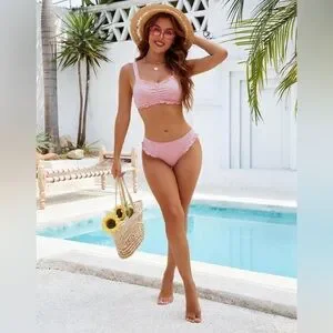 Enjoy the sun in this stylish pink ruffled bikini set. Perfect for a day at the beach or pool.