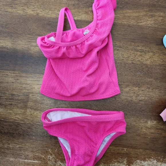 Stylish pink bikini set with ruffled top. Perfect for beach days.