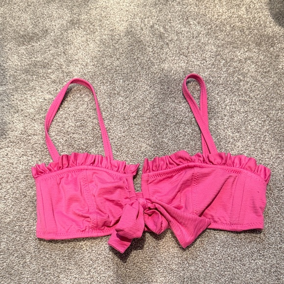 Flattering, hot pink Betsey Johnson bikini top with ruffled edges and a bow detail. No underwire but has wire supports that are very flattering and a V notch which gives good cleavage