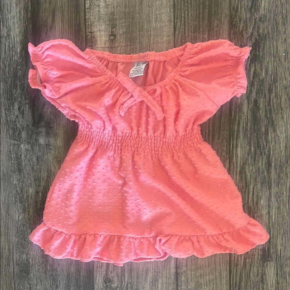 Charming pink blouse with ruffled sleeves and hem. Features a textured design and elastic waist.