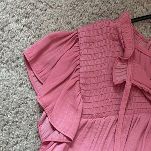 Chic and comfortable pink blouse with ruffled sleeves. Perfect for any occasion.