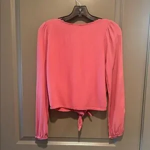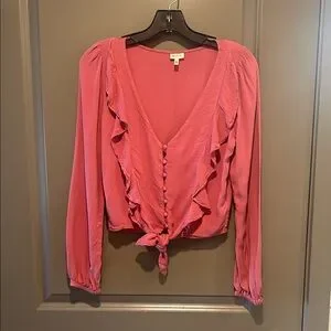 Dusty rose pink blouse with buttons and a tie hem. Hits at the waist. Gathered sleeves about 3/4 length.