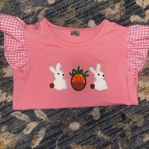 Adorable pink pajama set with ruffled sleeves. Features cute bunny and carrot design. Perfect for cozy nights.