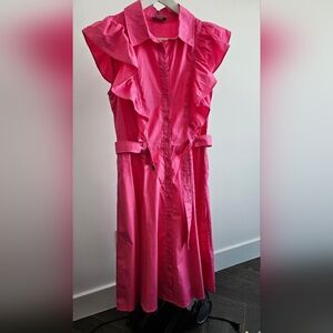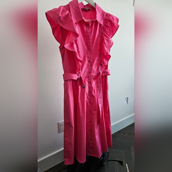 Stylish pink dress with ruffled details and button-down front. Perfect for any occasion.