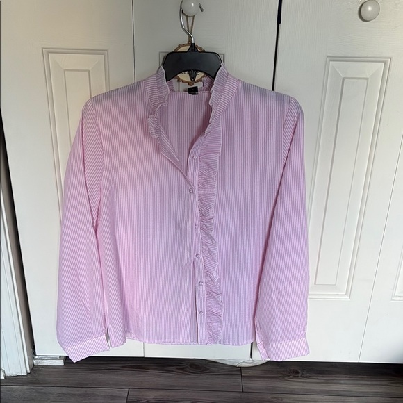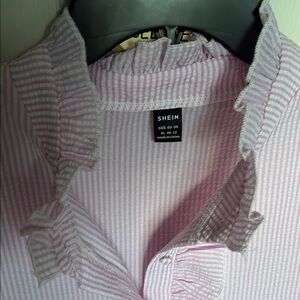 Chic pink blouse with ruffled details and button-up front. Perfect for a stylish look. Good business blouse or going out or beach cover!!! Never worn