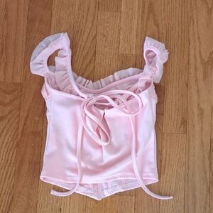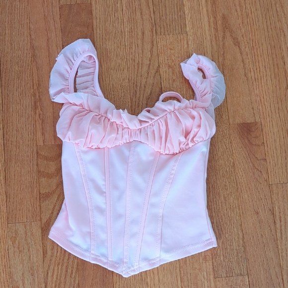 Chic pink corset top with ruffled details. Perfect for a stylish look.