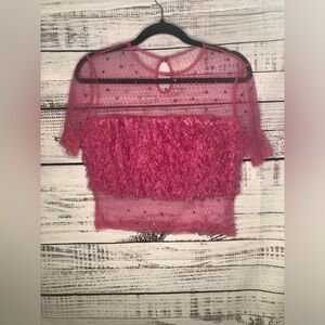 This vibrant pink crop top from SHEIN features a ruffled design with an embellished finish, perfect for adding a touch of elegance to any outfit. The intricate lace overlay offers a delicate texture, while the rounded neckline enhances its feminine appeal. Ideal for dressy occasions, this top combines style and sophistication effortlessly.