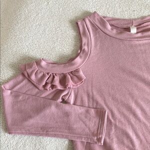 This elegant pink blouse features a stylish ruffled design with chic cut-out shoulders, offering a modern twist to a classic look. The soft fabric ensures a comfortable fit, making it a versatile addition to any wardrobe.