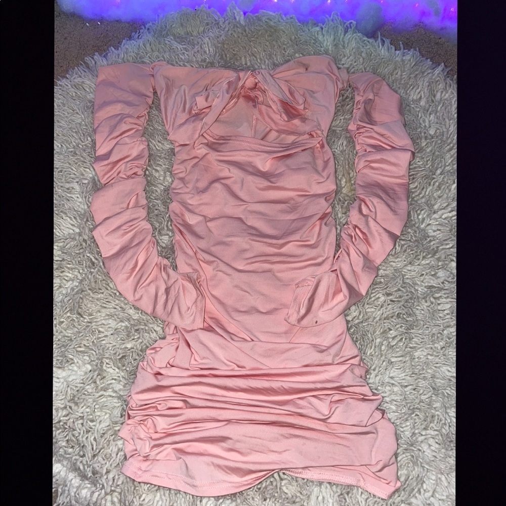 Small pink ruffled mini dress , long sleeved with shoulder cut off and an opening in the middle . ribbons can be tied to adjust to chest size ( worn once )