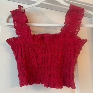 Charming pink ruffled dress perfect for any special occasion. Smocked bodice with lace detailing in the sleeves and skirt.