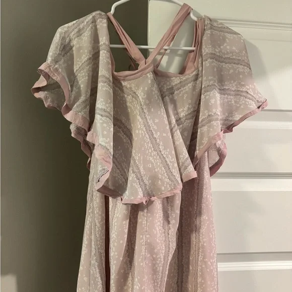 Elegant pink dress with ruffled sleeves. Features a delicate pattern. Off the shoulder with a tie around the neck