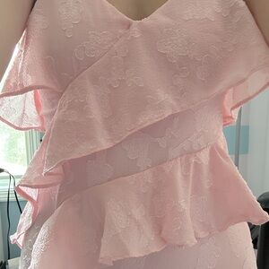 Elegant pink dress with ruffled lace details. Perfect for special occasions. Worn only a few times. No stains or rips. I just don’t wear it often.