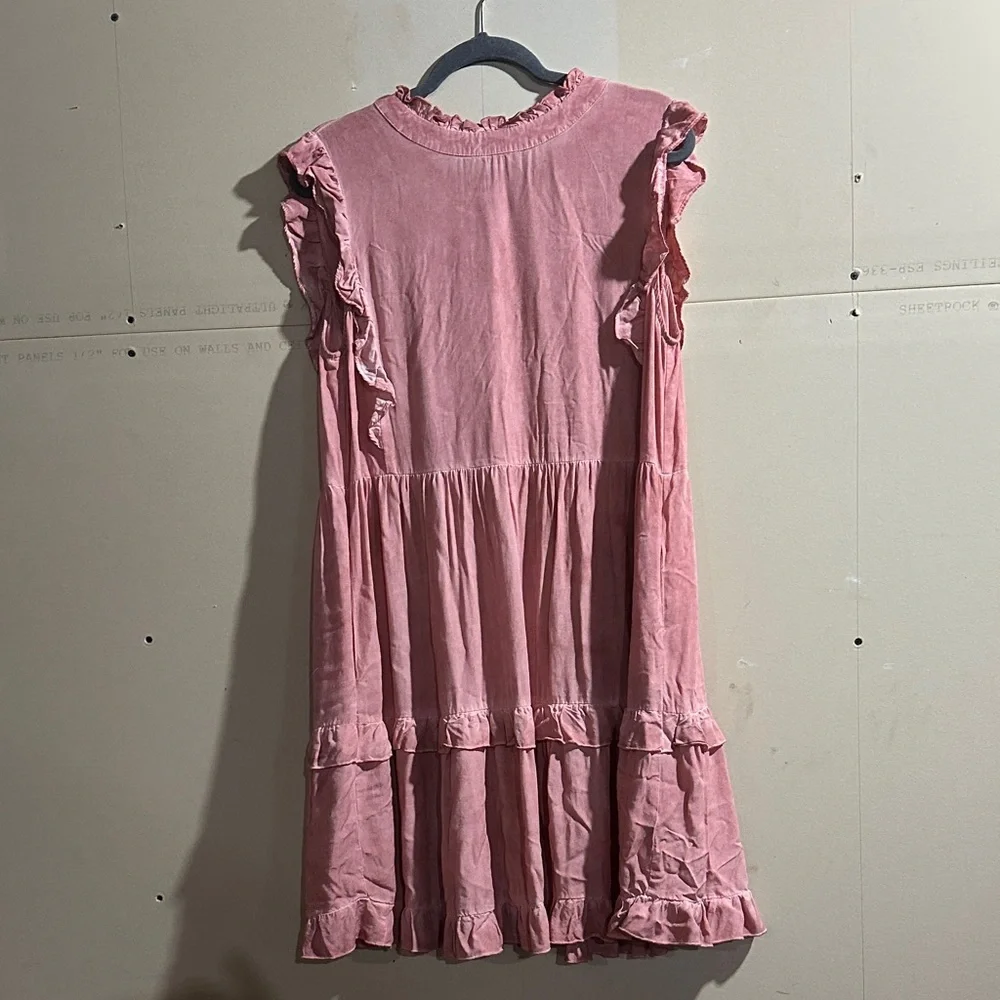 Charming pink dress with ruffled sleeves, perfect for any occasion.