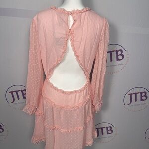 Chic pink dress with ruffled details and polka dots. Perfect for a stylish look.