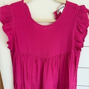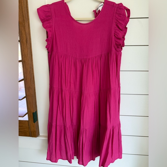 Charming pink dress with ruffled sleeves, perfect for any occasion. Purchased at local boutique. Color is a vibrant dark pink. Hits above knee (I’m 5’4)