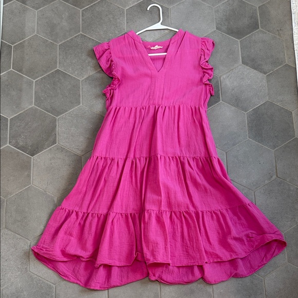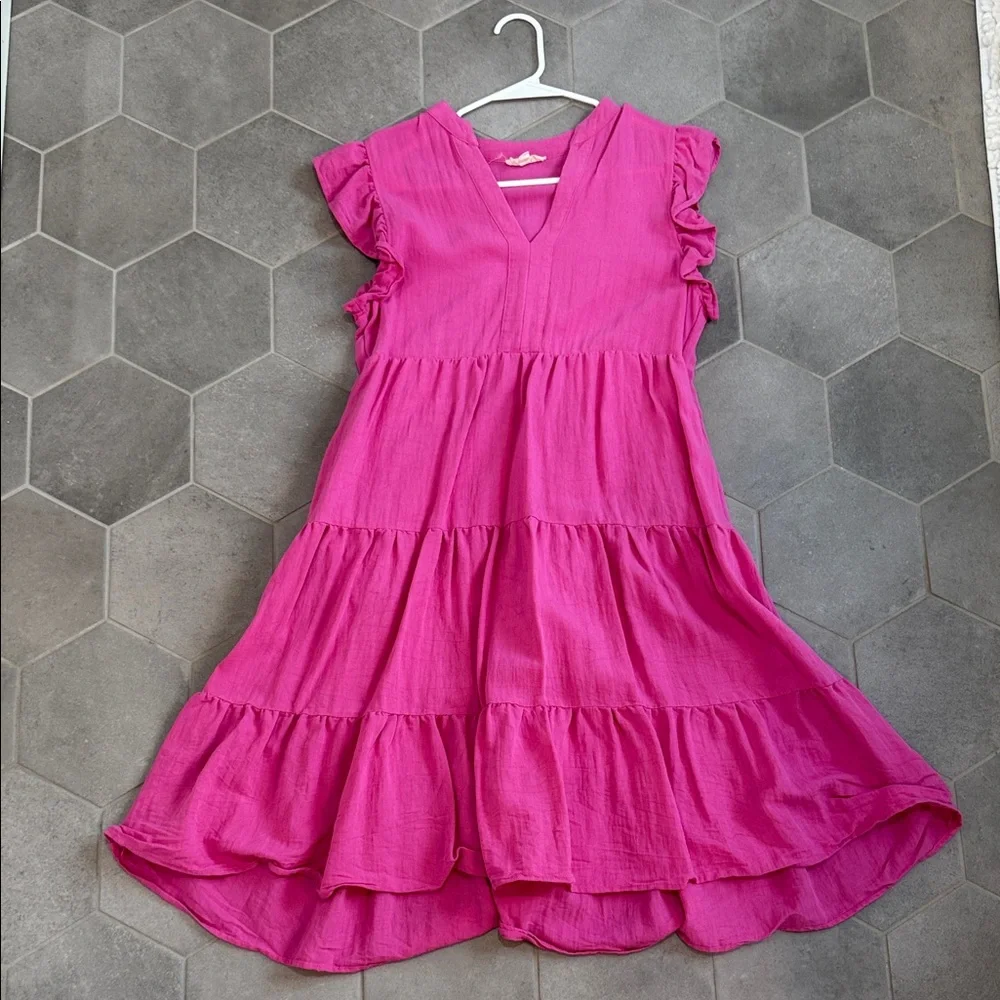 Charming pink dress with playful ruffles, perfect for any occasion. Lined!