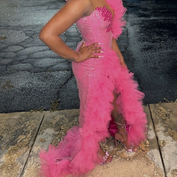 Stunning pink evening gown with ruffled details. Perfect for special occasions. Only worn for an hour. It’s a custom for size 2. Price negotiable.