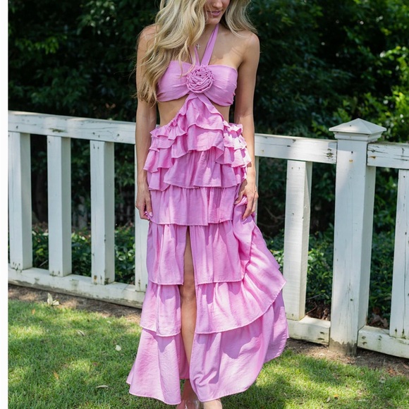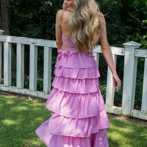 Elegant pink halter dress with ruffled layers. Perfect for summer events.