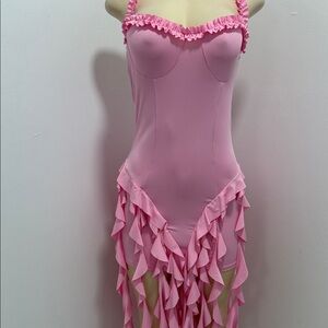 Elegant pink halter dress with ruffled details. Perfect for special occasions.