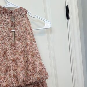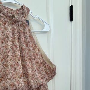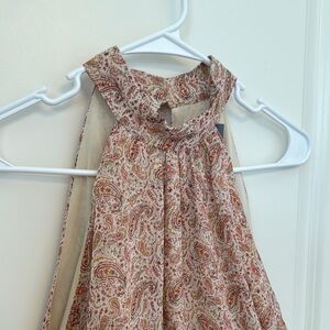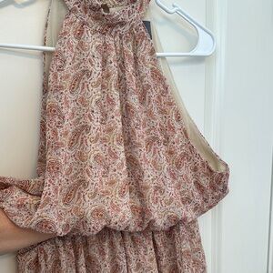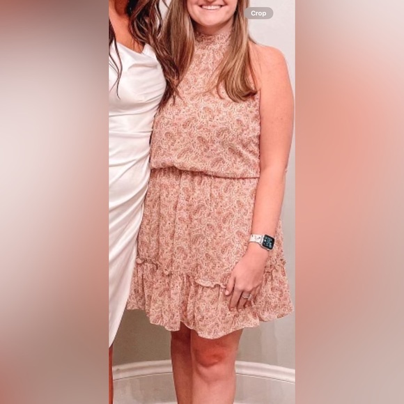This sleeveless mini sundress is perfect for a wedding guest or cocktail event. It features a halter neckline and a tiered, ruffled skirt that adds a playful touch to its elegant design. The dress is crafted from a light, airy fabric that drapes beautifully, ensuring comfort and style. It is also fully lined with a comfortable elastic waist.