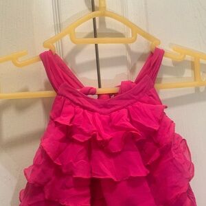 This charming pink ruffled halter is perfect for any special occasion or pairs great with jeans. Its vibrant color is perfect for the season. Tons of ruffles are great to enhance chest size. Silk . Back measures 14” and 16” armpit to armpit.