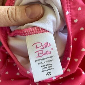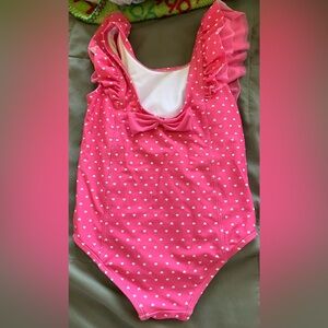 Charming pink swimsuit with cute heart design. Features playful ruffles. Mild wear as shown.