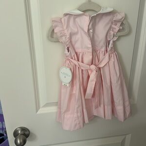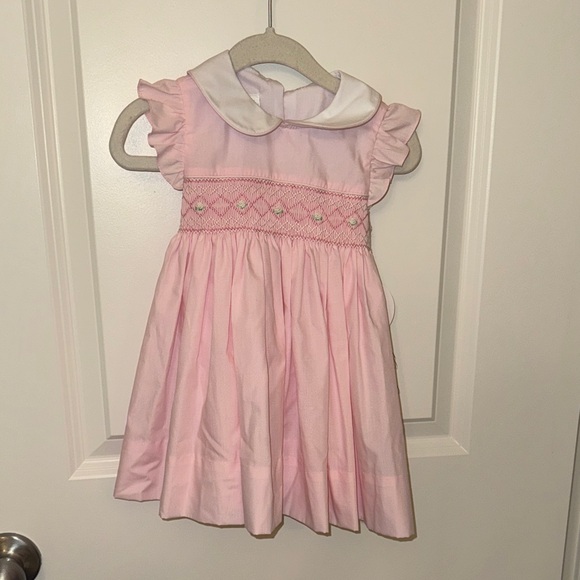 Adorable pink kids dress with charming ruffles and a classic collar. Perfect for special occasions.