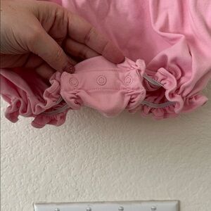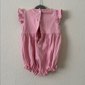 Adorable pink one piece with ruffled sleeves, perfect for your little one. Features charming embroidered details for a cute touch.