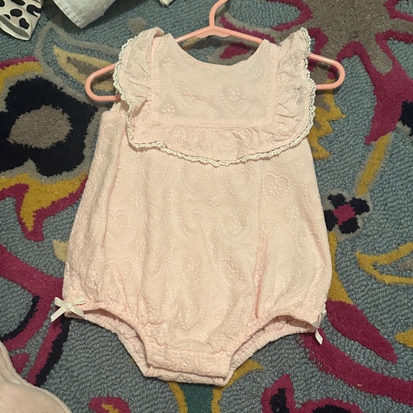 Adorable pink one piece with ruffled details, perfect for your little one. Soft and comfortable for all-day wear.