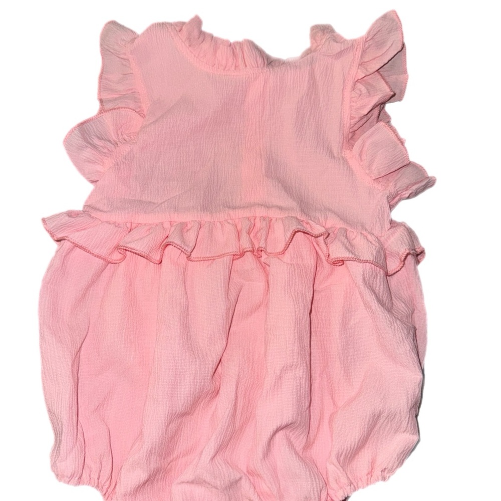 Adorable pink romper with ruffled details, perfect for your little one's wardrobe.