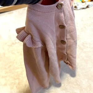 Adorable pink sweater with ruffled shoulders, perfect for keeping your little one cozy and stylish.