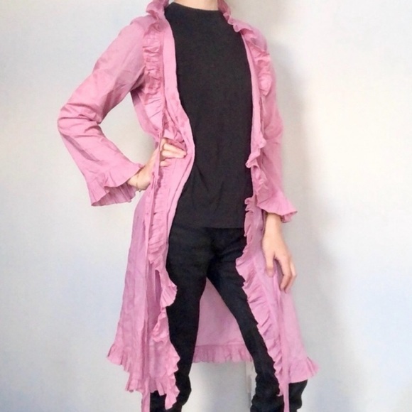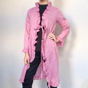 Stylish pink long jacket with ruffled edges. Perfect for layering.