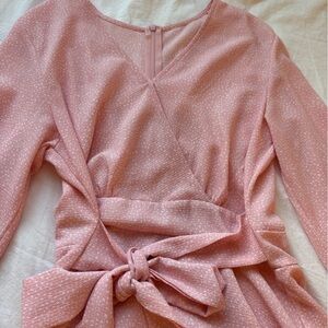 This is the cutest romper and so flattering. Perfect outfit for so many events (baby showers, bridal showers, tea parties, brunch)! Adjustable tie at the waist and clasps at the top.