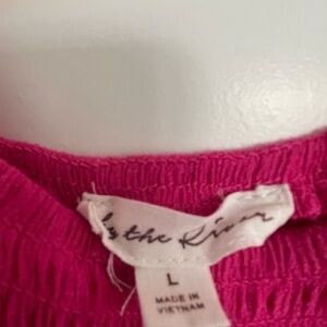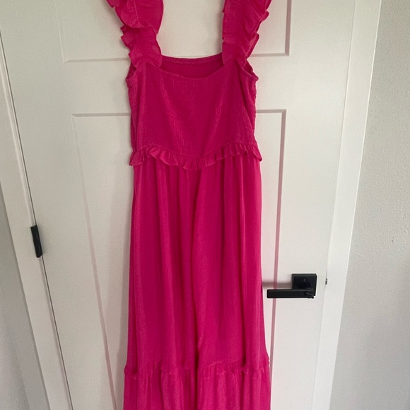 Elegant pink maxi dress with ruffled straps and hem. Perfect for any occasion.