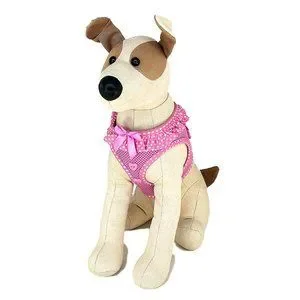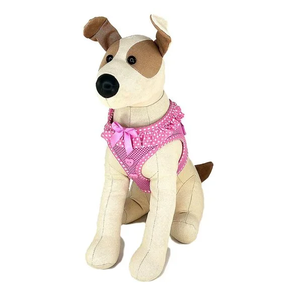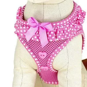 This cute harness is made of a breathable mesh material and has a polka dot ruffle around the neck, highlighted by a satin ribbon on the front. The polka dot pattern edges the rest of the harness. Finishing it off are two heart-shaped buttons below the satin ribbon. The step-in design makes it an easy on, easy off harness and is kept closed by strong velcro tabs and double secured with a quick release buckle. The pink harness comes in small, size 13"-16" around the chest. Made by Doggie Design, it's original price $28.